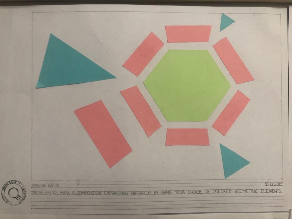 I wanted to indicate hierarchy by using the distance and size difference between my elements. However, the inability to use my area and my choice of color were affected my assignment badly. I couldn’t manage to transfer my measurements which i planned. The hexagon is the top of my composition and triangles show hierarchy between each other. …
