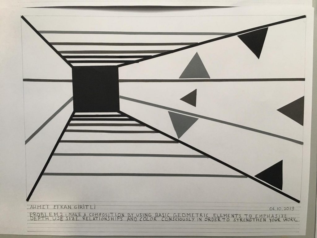 “Make a composition by using basic geometric elements to emphasize depth. Use size relationships and color consciously in order to strengthen your work.”